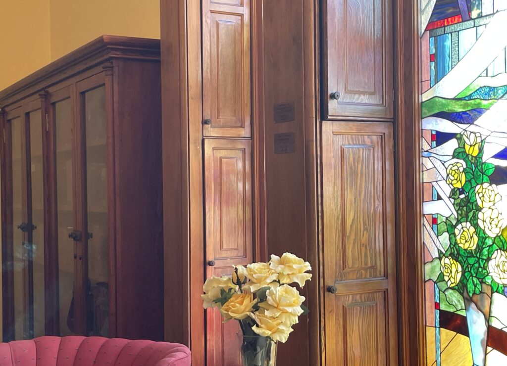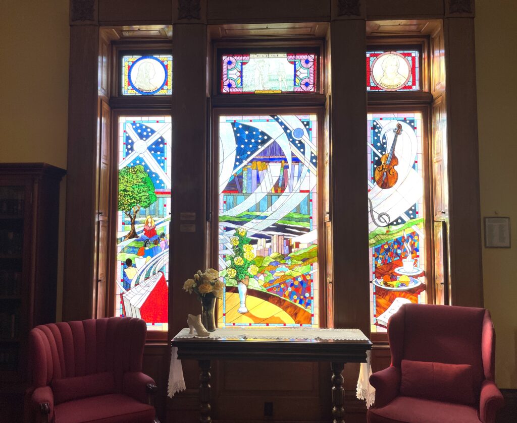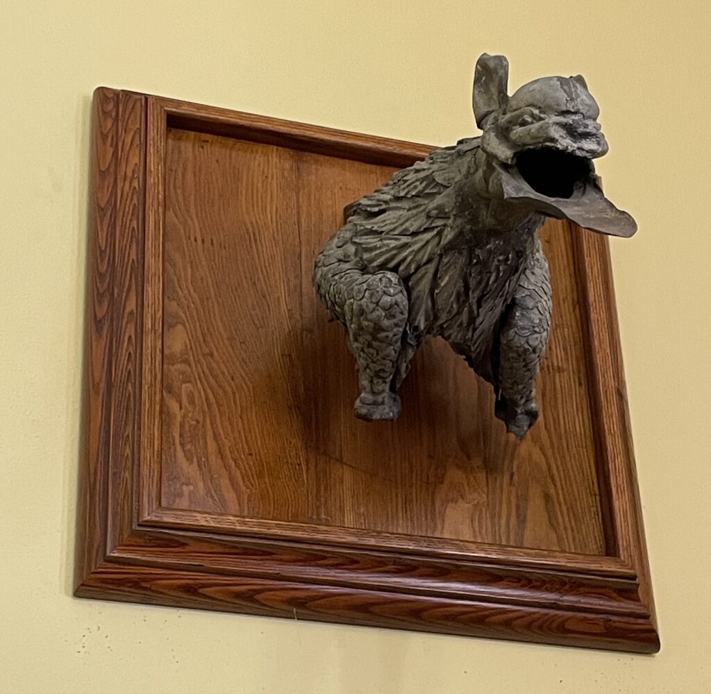 First Floor Photos: Fireplace Room Stained glass window in fireplace sitting room Restored shutters Gargoyle – originally placed on the building exterior