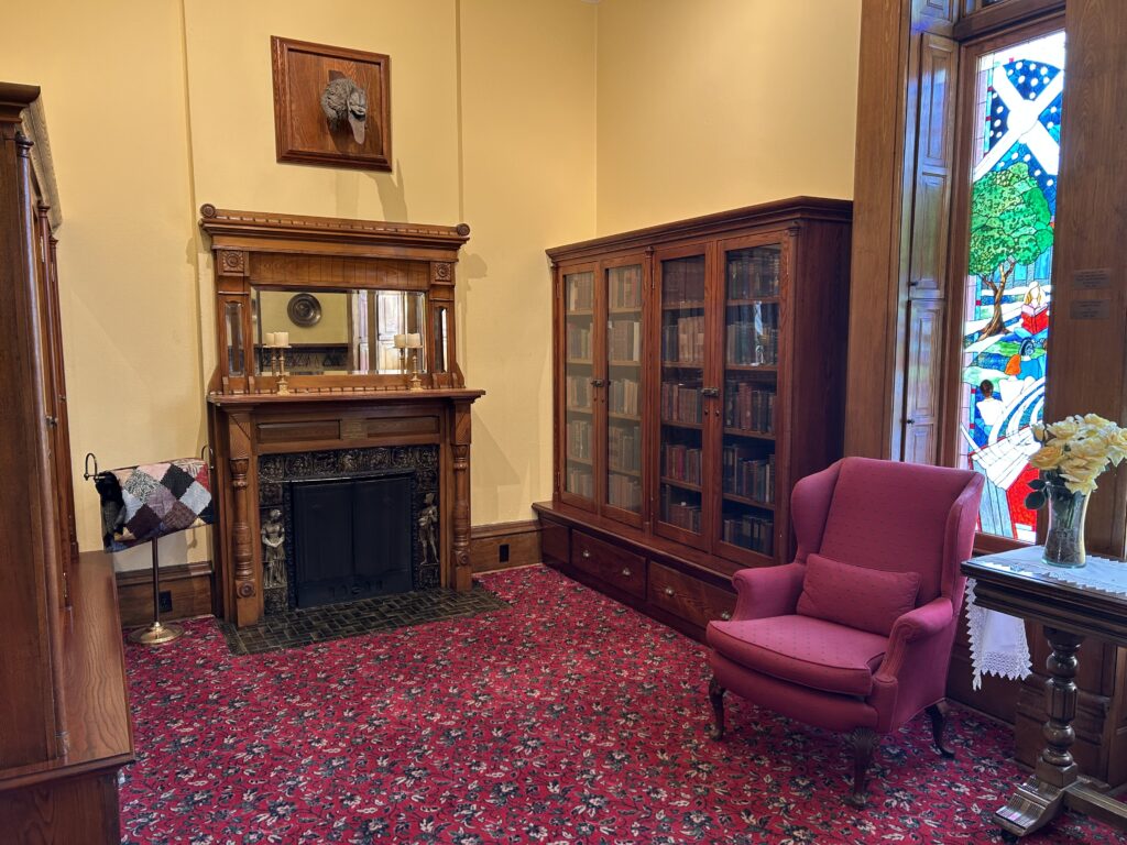 Warm and intimate, the fireplace room showcases restored architectural details, including a stained-glass triptych and the original exterior gargoyle, creating a comfortable setting for conversation and quiet reflection.