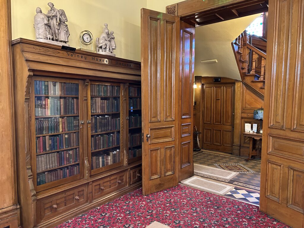 A gracious, light-filled room anchored by historic bookcases and flexible space for gatherings, the main library blends original character with versatility for events and community use.
